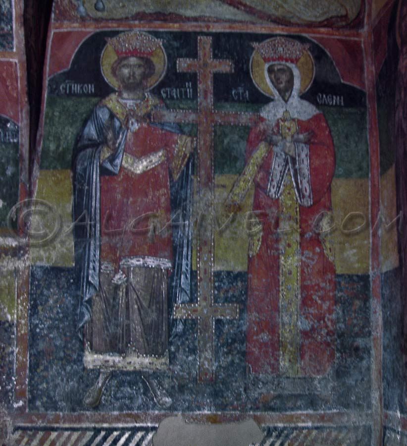 Ще Ви кажа само, че когато отидете трябва непременно да попитате за Мария Египетска, за чешмата и самуиловите войни, за Свети Николай Нови за Свети Георги и Свети Димитър, изрисувани само тук и в Атон в цял ръст, а не на кон, както сме свикнали да ги виждаме.От дясно е Св. Георги, а от ляво Св. Димитър.