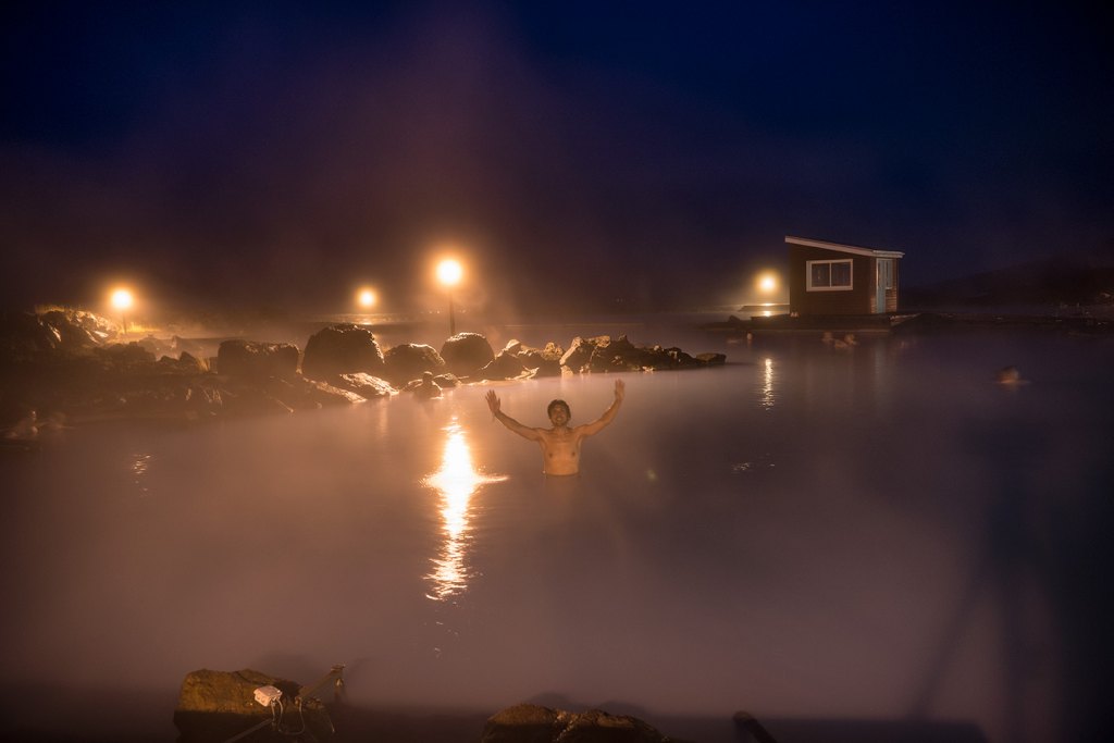 Мии, трябва ли да казвам, че отново сме назад с времето ? Пристигаме на лагуната (май името беше Jarðbaðshólar) минути преди 21 часа, но тя слава Богу все още е отворена. Честно казано мисълта на сваля опаковката от дрехи, да вляза в бански и после да направя обратното упражнение ми се струва непосилна и отказвам да влизам. На другите не им пречи нищо и отивам да си направим обща снимка. Аз съм ей там в дясно долу , сянката на статива 😉