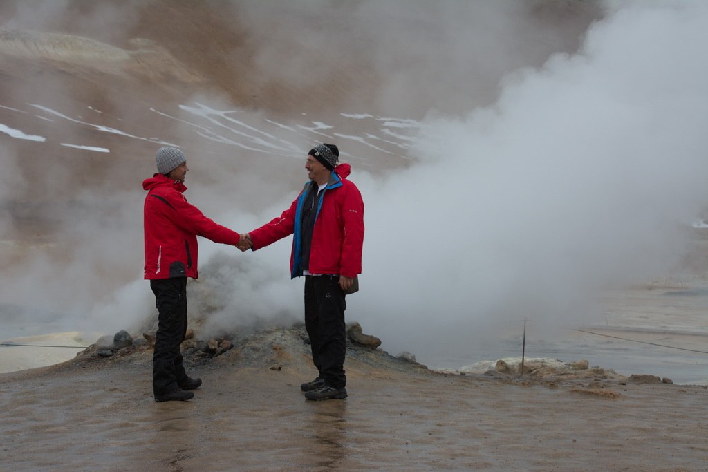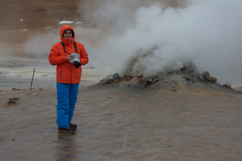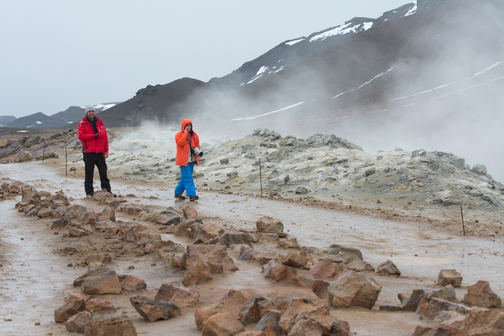 Според пътеводителя се движим сред планинската верига Námaskarð. Планинския хребет Námafjall пред който се намираме е висок 482 метра и е активен вулкан от системата на вулкана Krafla . Недалеч от нас земята буквално пуши – споглеждаме се – е лагуната може малко да почака.