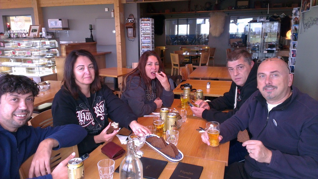 Съвсем близо до фермата предприемчивите стопани са построили няколко дървени къщи с топли и уютни стаи със самостоятелен санитарен възел. Ресторанта и магазина за сувенири са в самата ферма. Толкова сме прегладнели, че цената от 18 евро за порция гулаш въобще не ни плаши. Чакайки да ни сервират замезваме с нещо, което исландците наричат хляб. Според мен беше доста далеч от вкуса на хляба, но когато си гладен … След малко пристигат и основните ястия. Всичко е наистина много вкусно и в доста обилни количества.