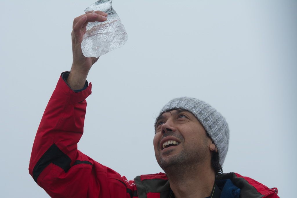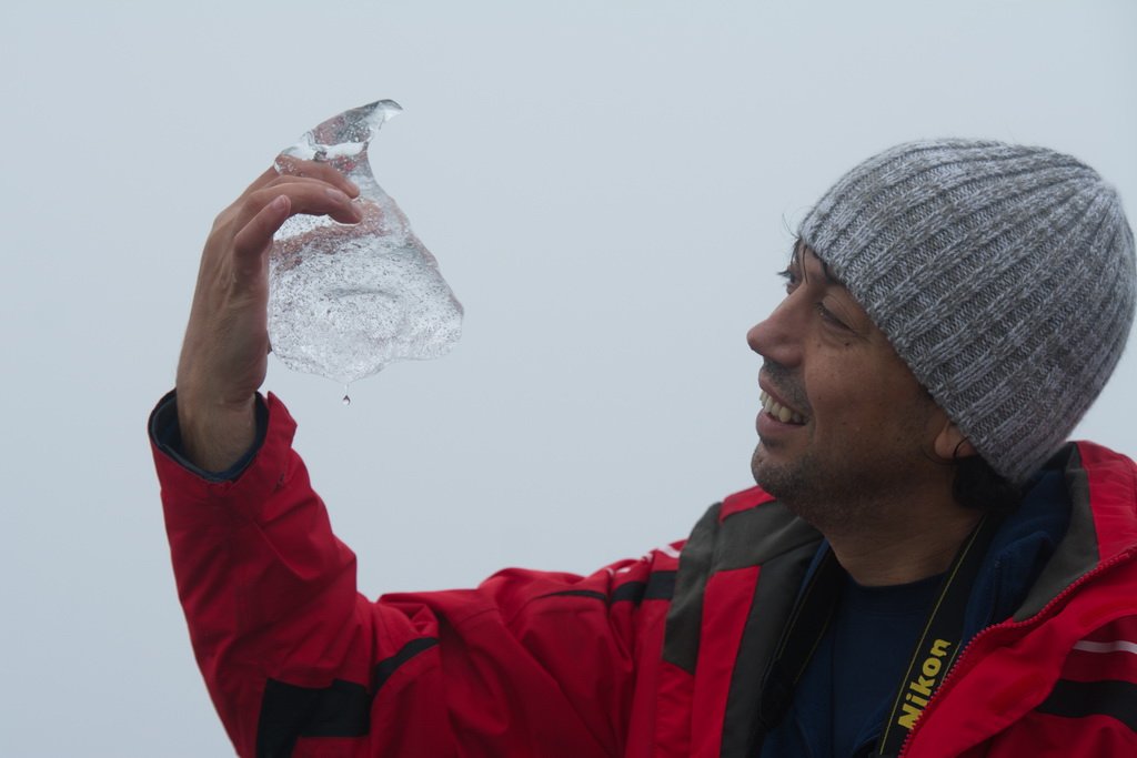 Скоро разбирам какво прави той – нашата лодка спира и той подава на капитана ни леден къс. Разказа започва с думите „там някъде в мъглата е глетчера, парчета от него се откъсват непрекъснато и тръгват към океана“.