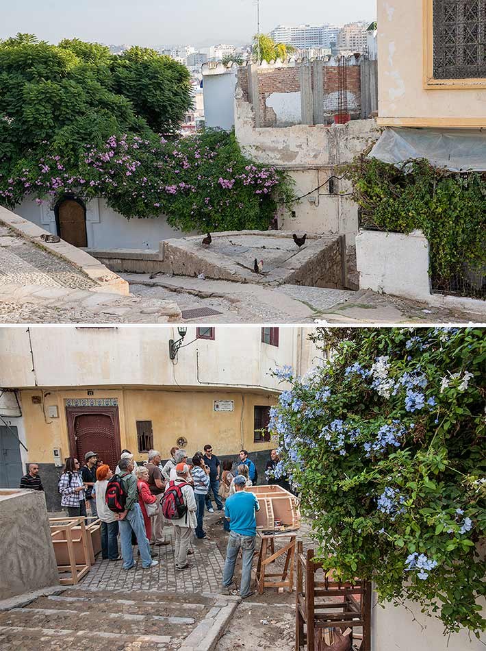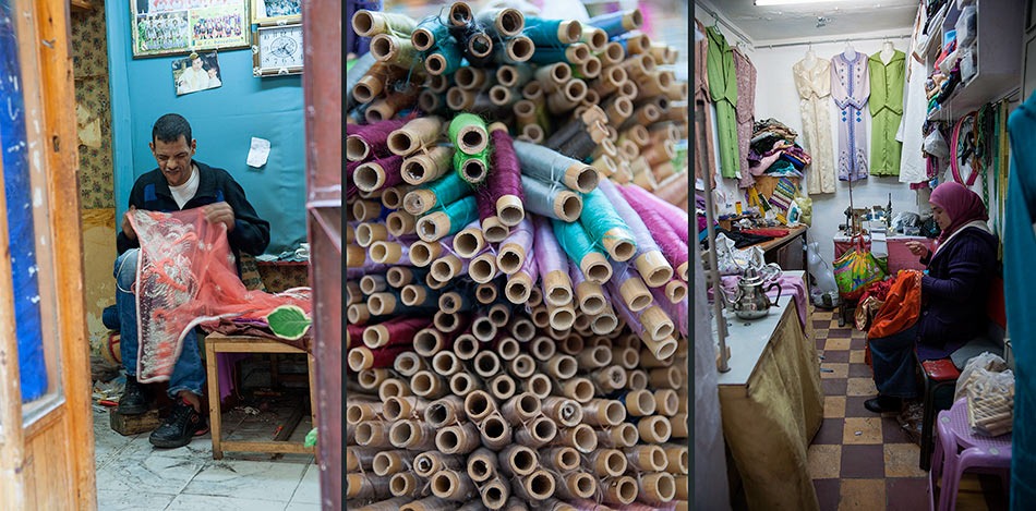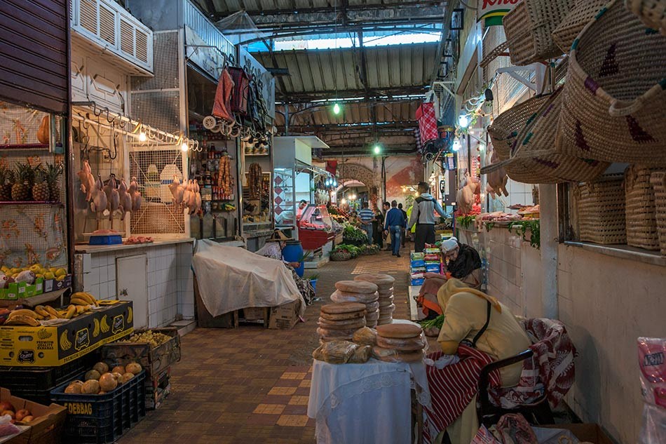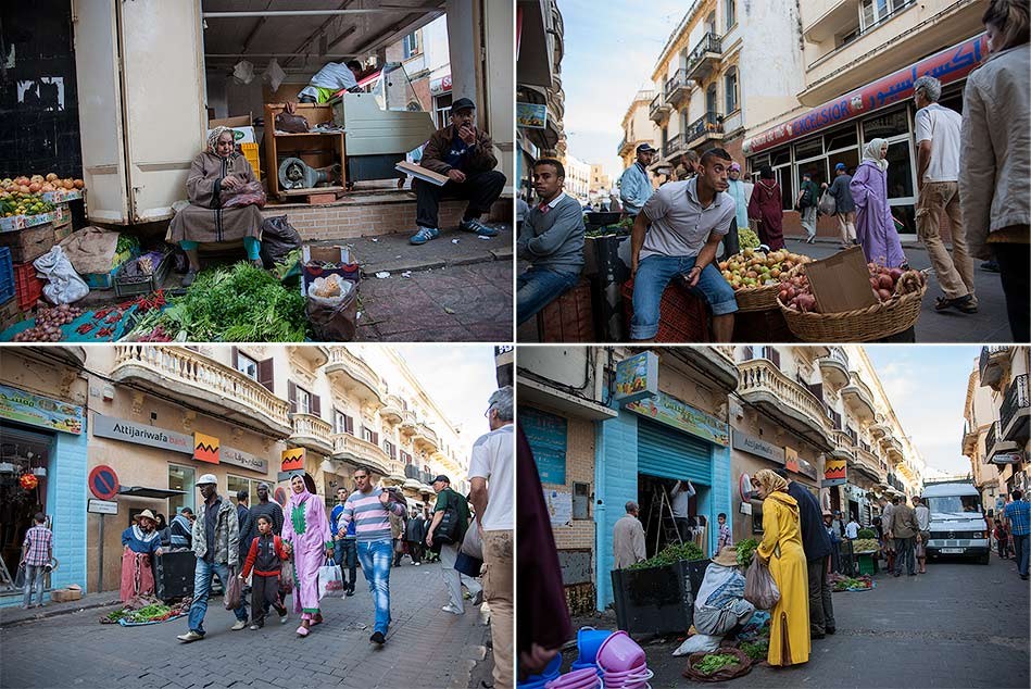 Вече сме с три часа назад от българското време и тук в Мароко е време за следобедна почивка. Тесните улички се поопустели , набират сили да се напълнят пак след няколко часа. Тръгваме по уличката на занаятите. Художник изнася картините си пред вратата и се готви за нови купувачи, дърводелец майстори шкаф, а петлите и кокошките, майсторят своите си работи по улицата. Шивачите бродират пъстри кафтани, а търговците излагат стоката си. Стръмните улици започват да се изпълват с народ, от всякъде продавачи викат, хора минават покрай теб и през теб. Излизаме през друга порта на медината, за да свием в ляво и отново да се гмурнем в морето от улични продавачи, малки дюкянчета и сергии. Продавачите в магазинчетата са главно мъже, а жените продават зеленчуци и хляб. Дюкяните са пълни с подправки, сувенири, тажини и какво ли още не. Пазарът е пренаселен от търговци и купувачи. В покрития пазар маслините съжителстват с хляба, пилетата – с плодовете. В Мароко не се продават замразени пилета, минути преди да си ги купите те щъкат живи в клетки на пазара. Наближава коч байряма и кочовете също са изложени на пазара. Според ислямската традиция на този празник всяко семейство купува коч и задължително разделя месото на три части – първата за семейството, втората за близките, а третата за бедните. Така никой няма да остане гладен на празника. Освен печена царевица, търговец предлага и плода на вид кактус, който расте в изобилие на мароканска земя. Плода се обелва и се яде – опитахме, но не тук, а в Тетуан – нашата следваща дестинация.