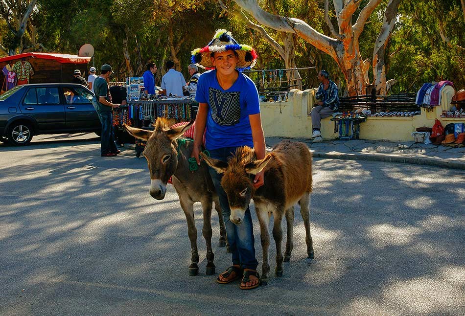 Вниманието ни тук е привлечено и от финиковите палми с огромни размери и гроздове фурми по върховете, и от младото магаретарче с интересна, шарена, сламена шапка. То се усмихва за снимки и позира с удоволствие, но не безплатно разбира се – в момента в който свалиш апарата, тръгва към теб и иска дирхами. Дирхам е местната валута и приблизително десет дирхама се равняват на едно евро.